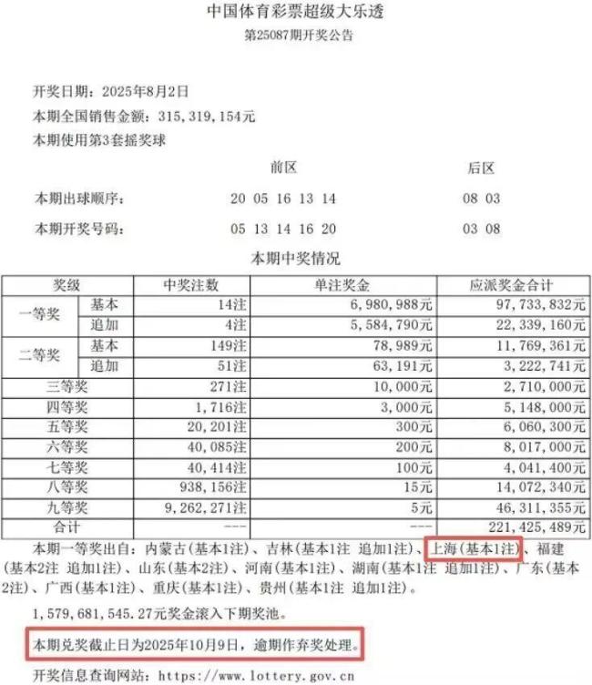 8月2日,超级大乐透第25087期开奖,前区号码为05、13、14、16、20,后区号码为03、08。上海开出一注基础一等奖,中奖彩票是一张“7+2”复式票,单票奖金701万余元