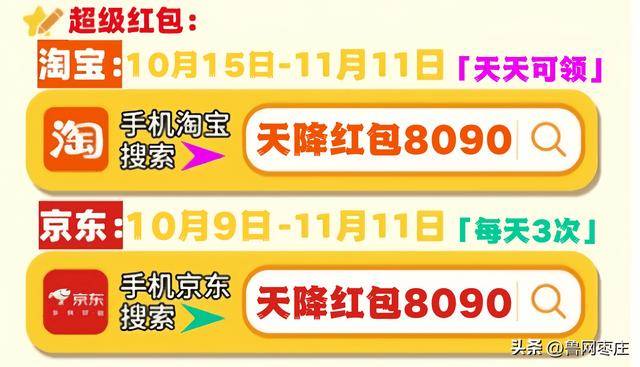 首先,划重点!今年天猫/淘宝和京东最新的双十一主要红包口令都是「天降红包8090」要记住!领的红包大小和你搜索的什么口令有关的!“天降红包8090”这个双平台通用红包口令包领到大的!记得每天去领!