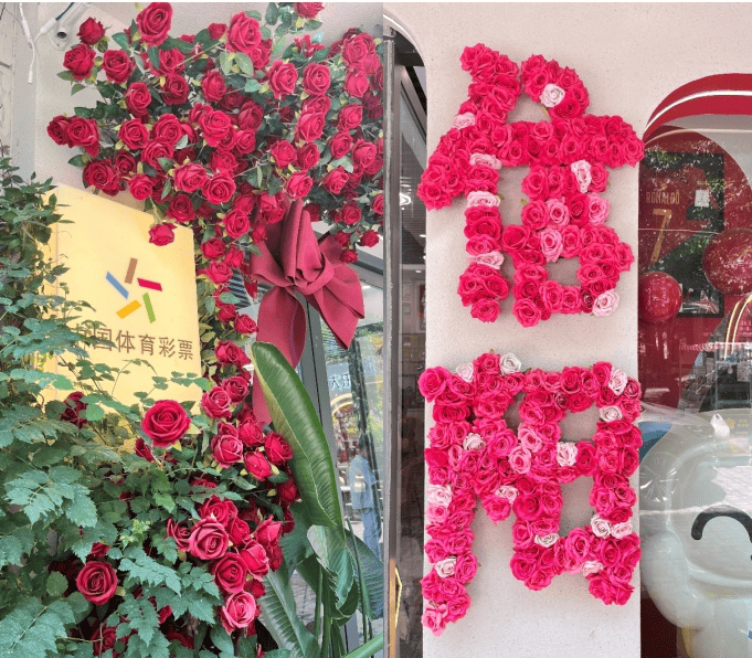 店铺门口用玫瑰花铺就的“瀑布”倾泻而下,“信阳”二字浪漫又吸睛。不少路人被这梦幻的场景吸引,忍不住驻足拍照,还会好奇地进店询问:“你们这家店是干啥的呀?怎么这么有创意!”
