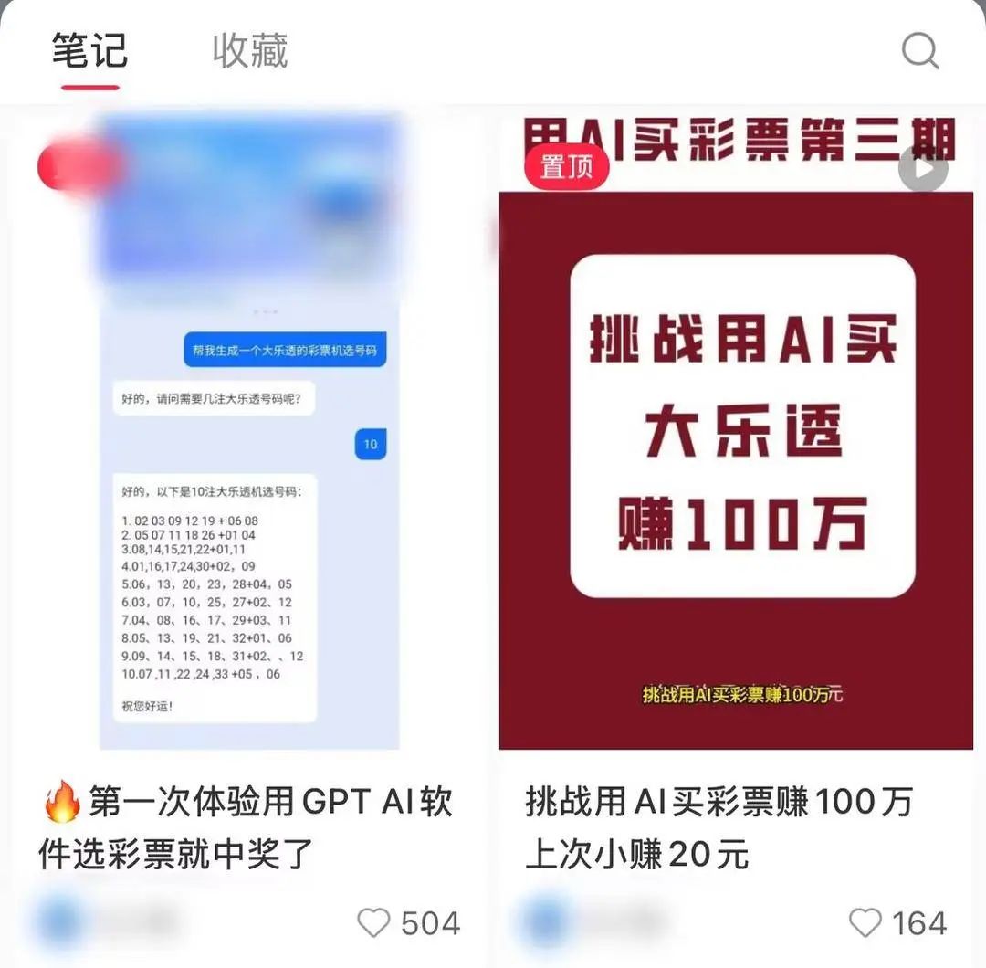 另外,还有标题为“第一次体验用GPT AI软件选彩票就中奖了”的笔记存在。相关笔记的封面图片中,用户输入“帮我生成一个大乐透的彩票机选号码”,并给出需要10注的指令,AI软件则给出了10注大乐透机选号码。第二张图片则是“已兑奖5元”的彩票照片。该笔记吸引来五百多个点赞、数十条留言,评论区还有不少网友询问“是什么APP”“怎么下载呢”“我也想中,求带”。该笔记正是由该款AI软件发布,起到吸引网友下载软件的营销广告效果。该账号首页还发布过多篇类似的内容,均为以“AI预测彩票中奖了”的包装形式,推销自家的AI软件。