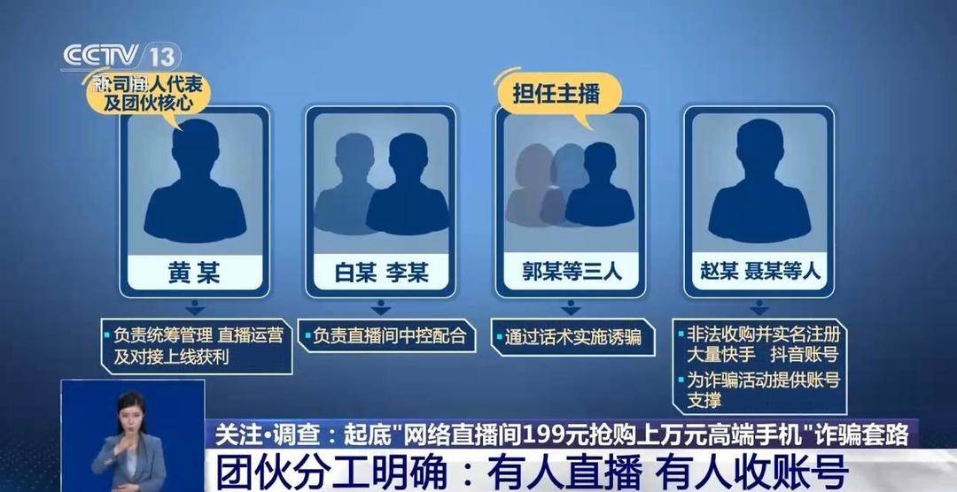 经查,这个团伙分工明确,黄某作为公司法人代表及团伙核心,负责统筹管理、直播运营及对接上线获利;白某、李某负责直播间中控配合;郭某等三人担任主播,通过话术实施诱骗;赵某、聂某等人非法收购并实名注册大量快手、抖音账号,为诈骗活动提供账号支撑。